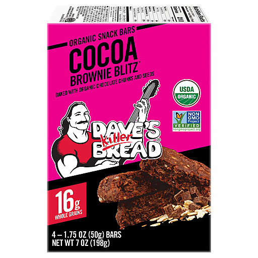 Baked with organic chocolate chunks and our signature mix of seeds, Dave's Killer Bread® Cocoa Brownie Blitz® Organic Snack Bars satisfy your chocolate cravings while packing the whole grain nutrition you expect from Dave's Killer Bread. Individually wrapped for an on-the-go snack or breakfast, Cocoa Brownie Blitz bars are USDA organic and baked with a killer mix of seeds and oats. 7g fiber per bar. Plus, each Non-GMO Project Verified, USDA organic snack bar includes 16g of whole grains and is sure to take your breakfast to the next level. Dave's Killer Bread Bars have no high fructose corn syrup, no artificial preservatives and no artificial ingredients. You can trust Dave's Killer Bread to deliver killer taste, texture and whole grain nutrition. Cocoa Brownie Blitz Organic Snack Bars are perfect for satisfying those chocolate cravings with a hearty serving of whole grains.The story of Dave’s Killer Bread began at the Portland Farmers Market, when Dave Dahl and his nephew brought some loaves of Dave's bread to sell. For Dave, this marked the beginning of a new chapter in his life. Though he grew up in a family of bakers, his life took a different path. A path that landed him in prison for 15 years. Determined to prove his worth and make a positive impact, Dave worked tirelessly to bake breads that tasted unlike anything else on the market — packed with seeds and grains, made with only the very best organic and Non-GMO Project Verified ingredients. Dave’s Killer Bread believes everyone is capable of greatness. One in three of the company's employee partners at their Milwaukie, OR bakery has a criminal background—but your past doesn't define your future. As a proud Second Chance Employer, Dave’s Killer Bread truly believes everyone deserves a second chance to become a Good Seed.