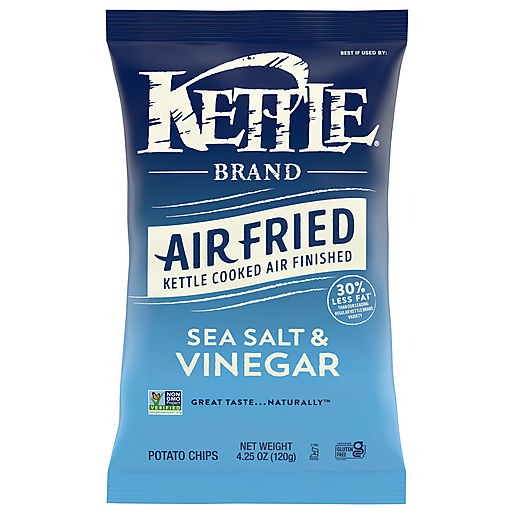 Kettle Brand Air Fried Sea Salt & Vinegar Kettle Chips are kettle cooked, air-fried chips that delivers a light and crispy crunch with no compromise on taste and texture. Their balanced flavor of sea salt and tongue-puckering vinegar deliver 100% bold Kettle Brand flavor with 30% less fat and a lighter texture than our regular Kettle Brand Sea Salt & Vinegar Chips. Delight your taste buds with our take on this flavorful favorite. When you open a bag of our Kettle Brand potato chips, you know you're getting incredible kettle chips made with authentic recipes by real people. From their farms to our kitchens and then to your home, the time and attention every Kettle Brand worker puts into their products is care you can trust. All that, plus Kettle Brand Air Fried chips deliver a delicious snack that’s Non-GMO Project Verified and Certified Gluten Free. You can share this 4.25-ounce bag of chips with a friend, but we won't blame you if you keep them all for yourself.