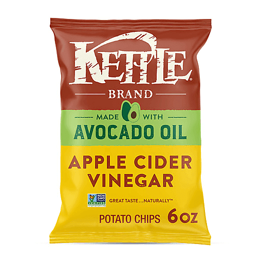 Open a bag of Kettle Brand Made with Avocado Oil Apple Cider Vinegar Chips and get a burst of flavor in every bite. A twist on the classic sea salt & vinegar flavor, these Apple Cider Vinegar kettle chips are tangy and perfectly balanced. Boldly flavorful, every bite of these potato chips is packed with zing and crunch. Gluten free and made with non-GMO ingredients. Great taste...naturally™