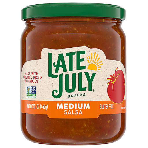 Late July® Snacks Medium Salsa has a zesty kick with bold flavors. This thick and chunky salsa is crafted with organic diced tomatoes, onions, garlic and jalapenos. The result is a hearty, chunky salsa in a sofrito blended base that highlights the flavors of all the high-quality ingredients with a balance of spice, so everyone can enjoy this salsa dip. The best parties need a few simple things great friends, great stories and delicious food. These three things always come back together around a big bowl of Late July tortilla chips and a jar of our medium organic salsa. Each 15.5 oz jar of red salsa offers about 14 servings, perfect for sharing with family and friends. Elevate your taco dip, breakfast burritos and other favorites with our gluten free tomato salsa. It also makes the perfect addition to your favorite recipes, from chicken flautas to huevos rancheros. We care deeply about using the highest quality organic and non-GMO ingredients with no artificial flavors or preservatives, so you can enjoy snacks that are simple, pure and good. And we never sacrifice on taste. Unquestionable tasty goodness.
