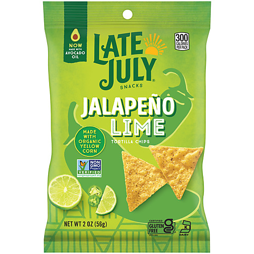 Enjoy the bold taste of our Late July Jalapeño Lime Tortilla Chips. Our tortilla chips are made with organic yellow corn and seasoned with a bold kick of jalapeño pepper and the fresh taste of lime that you can enjoy right out of the bag. We hope you’ll love them as much as we do. Late July is the sweet spot of summer. It’s a moment in time when life is simple, pure and good. And our chips take you there, any time of year. It’s also our name and our snack-making philosophy. Since 2003, we have been obsessed with crafting the world’s most delicious snacks with only the finest organic and non-GMO project verified ingredients. And our 100% whole-grain chips are made in a facility that does not process peanuts. We have a delicious new look, and the same amazingly crafted taste. These 2 ounce snack packs of Late July Tortilla Chips are great for taking on the go or enjoying as a side with lunch. Thanks for snacking with us.