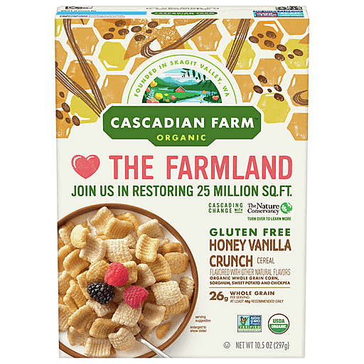 Organic whole grain corn, sorghum, sweet potato and chickpea. Honey vanilla crunch flavored with other natural flavors. Gluten Free. USDA Organic. OTCO Certified Organic by Oregon Tilth. 26 g whole grain per serving. At least 48 g recommended daily. Non GMO Project Verified. nongmoproject.org. Founded in Skagit Valley, WA. Cascadian Farm. The farmland. Join us in restoring 25 million sq. ft. Cascading change with the nature conservancy turn over to learn more. As one of the earliest pioneers of organic agriculture, we have spent more than 40 years working to protect our planet through actions like planting pollinator habitats, helping farmers build healthy soil, and integrating climate-smart crops into our products. But there is much more work to be done. Step-by-step, we are reimagining the relationship between food, farmland, nature & communities, seeking to drive and inspire meaningful change along the way. This package is sold by weight, not by volume. You can be assured of proper weight even though some settling of contents normally occurs during shipment and handling. www.cascadianfarm.com. how2recycle.info. We welcome your questions or comments. 1-800-624-4123. Visit us at www.cascadianfarm.com. Box Top for Education: No more clipping. Scan your receipt. See how at btfe.com. Certified 100% recycled paperboard. Creating a wave of cascading change. Our mission is to create Cascading Change to help protect our planet - because small steps can lead to great impact. Our journey has taken us to the critical foodshed of the Sacramento Valley, CA. We're partnering with The Nature Conservancy to protect natural resources like wildlife habitat and groundwater to help farms become more resilient. After all, farms encompass more than just the land at our feet - they include a rich ecosystem above and below ground. By choosing Cascadian Farm, you show support for our commitments to projects like these - in this case, our donation of $750,000 to help build resilience across more than 600 acres, 1 sq ft at a time. Join us in Cascading Change. Learn more at cascadianfarm.com. Cascadian Farm is committing $750,000 to our partners at the nature conservancy whose mission is 'to protect the lands and waters on which all life depends (www.Nature.Org). Over the course of 12/2020-12/2022, our contribution will help rebuild wildlife habitat and regenerate groundwater on over 600 acres of farmland in the Sacramento valley, ca. The goal is to restore health to the farm ecosystem, in turn making farming operations more resilient to threats like climate change. Donation to the conservancy not contingent upon purchase.